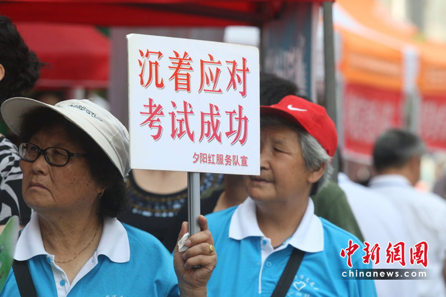6月7日,為期兩天的2010年普通高等學(xué)校招生全國(guó)統(tǒng)一考試開(kāi)考,全國(guó)將有957萬(wàn)考生走進(jìn)考場(chǎng)。圖為在哈爾濱一考點(diǎn)外,夕陽(yáng)紅服務(wù)隊(duì)的老人舉起牌子鼓勵(lì)考生。小剛 攝