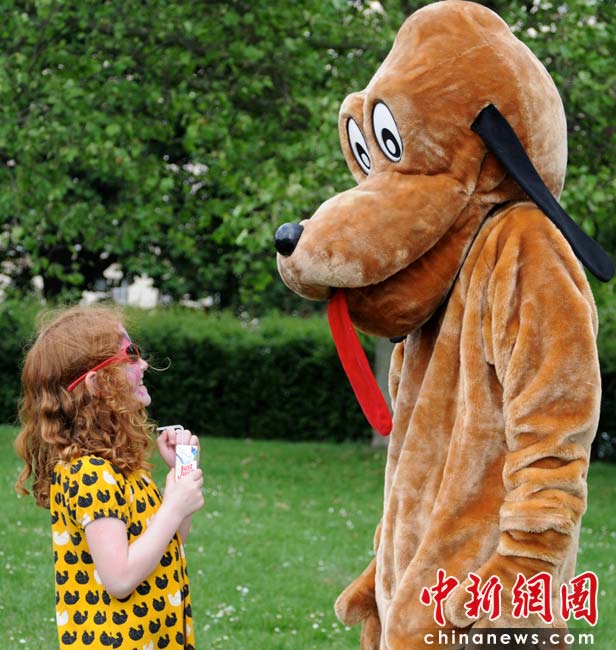 當地時間2010年6月6日,英國倫敦舉行卡姆登綠色市集(Camden Green Fair),這是英國倫敦每年環保領域的“重頭戲”。本屆市集的主旨是要喚起大眾對環境問題的關注,選擇更加可持續發展的生活方式。據活動主辦方預計,本屆市集將吸引來自英國各地和世界各國的2萬多人參加。圖為素食推廣志愿者扮成卡通狗吸引孩子。Fiona/攝 Fiona 馬小剛/文