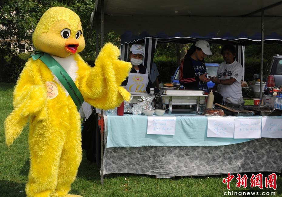 當(dāng)?shù)貢r(shí)間2010年6月6日,英國(guó)倫敦舉行卡姆登綠色市集(Camden Green Fair),這是英國(guó)倫敦每年環(huán)保領(lǐng)域的“重頭戲”。本屆市集的主旨是要喚起大眾對(duì)環(huán)境問(wèn)題的關(guān)注,選擇更加可持續(xù)發(fā)展的生活方式。據(jù)活動(dòng)主辦方預(yù)計(jì),本屆市集將吸引來(lái)自英國(guó)各地和世界各國(guó)的2萬(wàn)多人參加。圖為打扮成小雞的素食主義者宣傳素食。Fiona/攝 Fiona 馬小剛/文