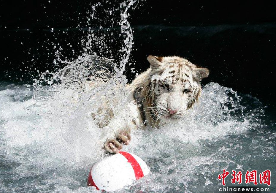 2010年6月7日,美國南卡羅來納州美特爾海灘,在世界杯即將開幕之際,一歲的小白虎Sundaram和孟加拉虎Mukti率先在水里上演了一出足球大戲。英格蘭隊首戰(zhàn)將對陣美國隊,因此足球外側也被印上了英格蘭旗的標志。cfp