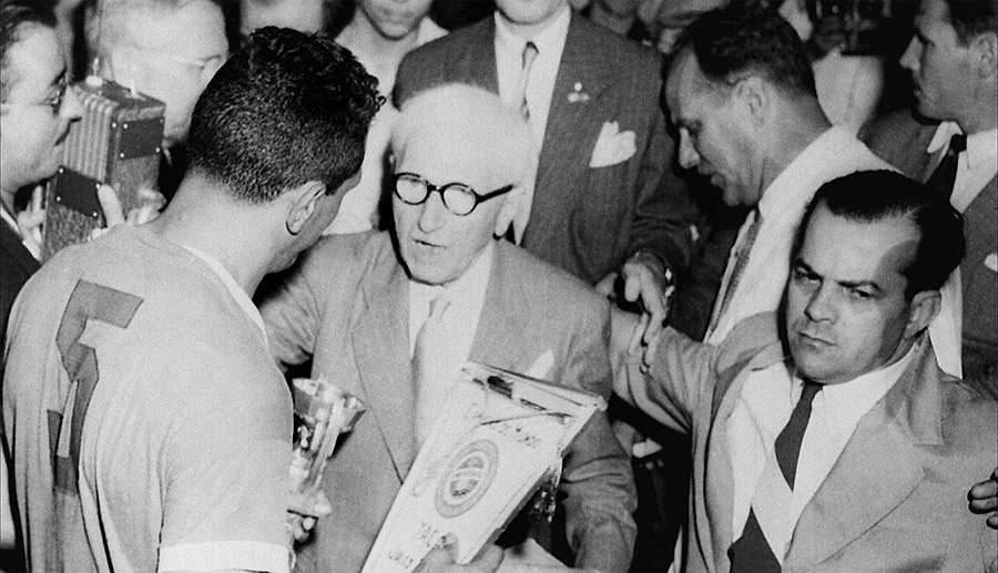 在與1938年法國世界杯時隔12年后,世界杯在里約熱內盧的馬拉卡納體育場和巴西其他城市再度舉行。世界杯在新的時代重新獲得新生。戰后國際足聯第一次大會于1946年7月25日在盧森堡舉行,國際足聯雷米特先生在戰爭期間為使足球精神不滅而鞠躬盡瘁。為了向他表示敬意,國際足聯世界杯被命名為“雷米特杯”,英國重新返回足球大家庭,巴西因在1938年世界杯上表現出色,從而獲得主辦權。