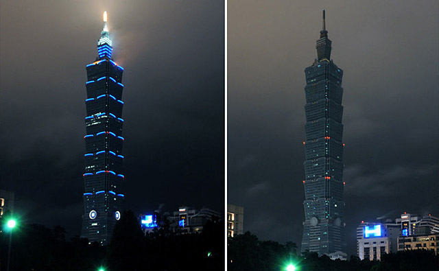 中國(guó)臺(tái)北。3月28日,熄燈前和熄燈后的臺(tái)北101大樓。