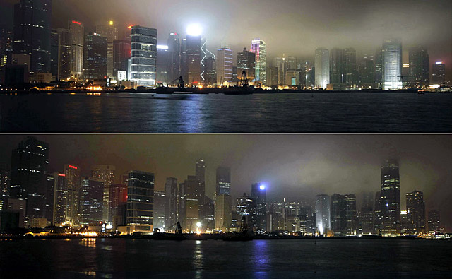 中國香港。3月28日,熄燈前后的香港維多利亞港港島一側。