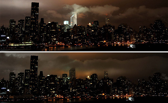 美國紐約:3月28日,美國紐約曼哈頓標志性建筑熄燈前(上)和熄燈后的對比情況。