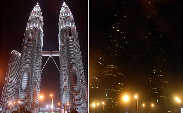 馬來(lái)西亞吉隆坡:3月28日,馬來(lái)西亞吉隆坡雙子星塔在參與“地球一小時(shí)”熄燈行動(dòng)前(左)與熄燈后(右)的情況。