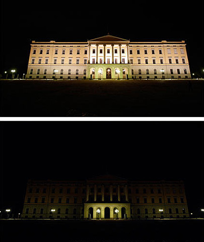 挪威首都奧斯陸:3月28日,位于挪威首都奧斯陸的挪威王宮熄燈前和熄燈后的對比情況。