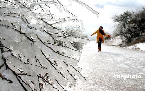 1月12日,雪后的江蘇連云港美不勝收。11日夜間連云港降下2008年第一場雪。連云港云臺山脈穿上一層白色冰衣,千姿百態,冰掛和雪凇宛如美麗的童話世界。中新社發 王健民 攝