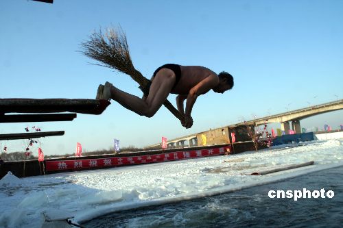 1月15日下午在哈爾濱公路大橋冬泳浴場,國內(nèi)外游客激情觀看冬泳。冬泳愛好者用各種姿勢做跳水表演,引來游客的歡呼聲,冬泳運動員不怕今天零下20多度的嚴(yán)寒,為讓游客滿意就是再冷也要多游兩次,好讓游客高興而來盡興而走。中新社發(fā) 姚庭山 攝