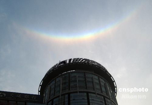 6月2日18時20分許,重慶鬧市解放碑上空出現異常彩虹。該現象持續20多分鐘,街頭行人紛紛駐足觀看并拍照。中新社發 石漢萍 攝