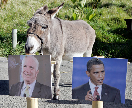 有好事者29日在加利福尼亞做了一個有趣的試驗(yàn)。讓一頭驢和一頭大象投票。令人意想不到的是,象征著民主黨的驢選擇了麥凱恩,而象征共和黨的大象卻選擇了奧巴馬。