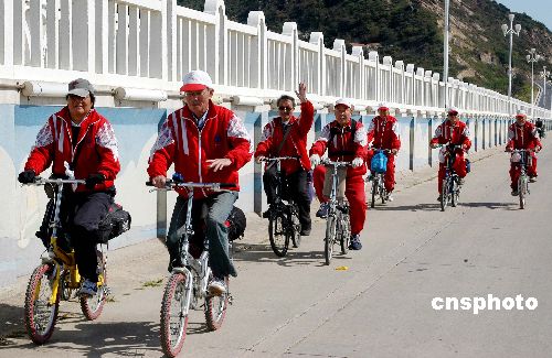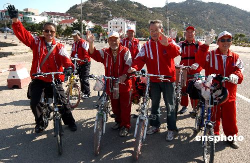 10月20日,由上海市老體協(xié)章向東等七位老人自發(fā)組成的“暢游蘇北迎奧運(yùn)”自行車騎游隊(duì)來(lái)到連云港。他們10月18日從徐州騎自行車出發(fā),終點(diǎn)為上海,途經(jīng)連云港、淮安、揚(yáng)州、泰州,計(jì)劃用15天時(shí)間到達(dá)目的地。騎游隊(duì)中年齡最大者80歲,最小的也70歲。老人們通過(guò)這種形式,既鍛煉身體暢游名勝,又是喜迎奧運(yùn)的一次有意義的活動(dòng)。中新社發(fā) 王春 攝