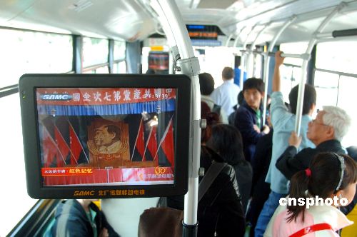 10月21日,北京公共汽車上的電視屏幕播放中共七大的紀(jì)錄影片。當(dāng)日,中共十七大完成各項(xiàng)議程后在北京人民大會堂閉幕。中新社發(fā) 廖攀 攝