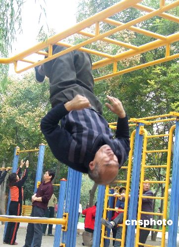 10月19日,九九重陽節,河南三門峽市虢國公園的健身梯上,一位七旬老人雙臂展開,兩腳勾住梯檔以“倒掛金鉤”的方式在不停地打秋千,他的動作讓許多年輕人都不敢嘗試。據了解,這位老人以前患病臥床不起,經過一年的堅持鍛煉,如今身體健康。中新社發 梁有才 攝