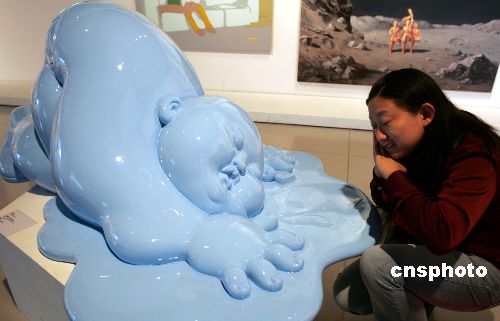正在上海舉行的動漫美學雙年展有許多作品趣味逗人,一名觀眾在《睡著了》作品旁做模仿狀。據悉,參展的近百件作品來自意大利、美國、中國大陸和臺灣地區。中新社發 潘索菲 攝