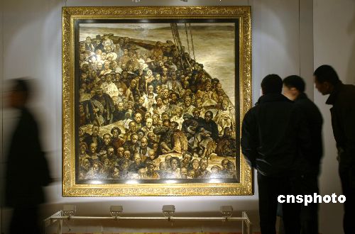 十一月四日,在嘉德2007秋季拍賣會預展上,觀眾正在觀摩中國畫家程叢林的油畫《華工船》。該作品以十九世紀華工背井離鄉、漂洋過海的血淚史為題材,是程叢林的代表作之一。該作品將于11月6日被拍賣,該作品估價超過2000萬元人民幣。中新社發 張煒 攝