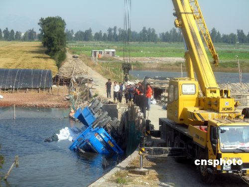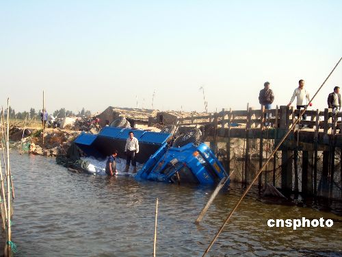 11月7日早晨5時(shí)許,一輛大貨車行駛至浙江溫嶺箬橫鎮(zhèn)西浦村新塘橋時(shí),壓斷小橋后貨、車和人一起翻入河里,幸好河水不深,駕駛室內(nèi)3人從車窗爬出逃生。據(jù)了解,此橋是該市十幾年前修筑東浦海塘?xí)r,為方便小型載貨車運(yùn)送石料而修筑,多年來(lái)該橋只能承受小貨車同行,且橋面已有多處開(kāi)裂。據(jù)悉,肇事車輛車身重8000公斤,加上載貨5000多公斤,共計(jì)13000公斤。中新社發(fā) 林貽高 攝