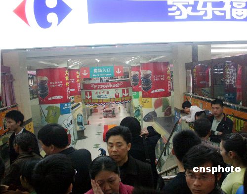 11月10日上午8時20分左右,重慶沙坪壩區家樂福商場內,發生一起因爭搶特價食用油造成的踩踏傷亡事故。目前已致3人死亡31人受傷,其中7人傷勢嚴重。圖為事故發生后,該超市隨即暫停營業,超市門口聚集大批當地市民。中新社發 郭晉嘉 攝