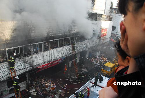 11月20日上午10時許,安徽蚌埠市區最大的小商品批發市場——太平街批發市場2號營業大廳發生火災,一層大廳2000平方米的近百攤位全部陷入火海中。一個多小時后,火勢又蔓延到二樓倉儲區。截至下午4時,余火仍在撲救中。目前沒有人員傷亡報告,經營戶貨品財物損失很大。 中新社發 安徽張建平 攝