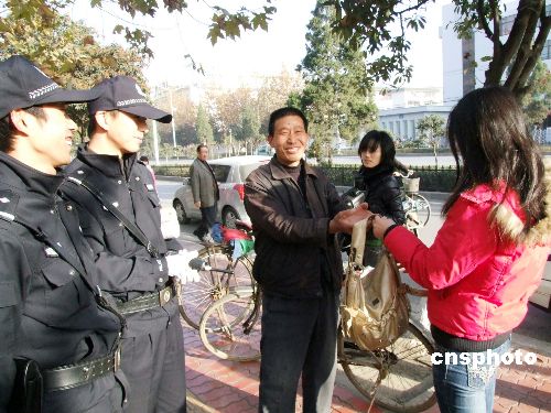 11月27日早晨,襄樊下崗工人王明浩在路上撿到一個女包,包里有1800多元現金和存有1萬多元的銀行卡,他隨即通過110巡警找到失主,并將錢物完好交還。據了解,2007年45歲的王明浩,是原襄樊萬山陶瓷廠下崗職工,下崗后他主要靠在市區建筑工地打工,每月收入約600元。 中新社發 李得榮 攝