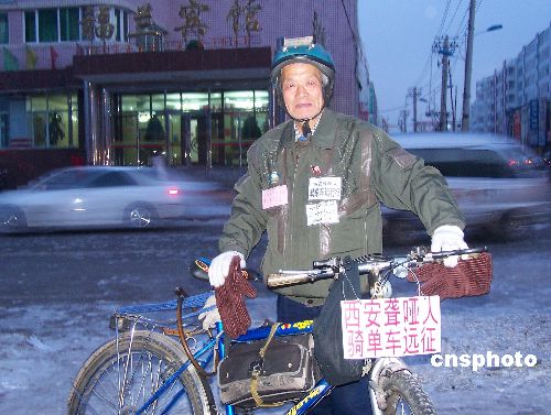 11月28日,來(lái)自陜西西安的一位頭發(fā)花白、精神矍鑠的聾啞老人唐應(yīng)成騎著單車(chē)抵達(dá)黑河市福蘭賓館附近。為了完成自己“走遍全中國(guó),宣傳2008年北京奧運(yùn)會(huì),成為全國(guó)聾啞第一人”的夢(mèng)想,從1997年4月5日開(kāi)始,在家人的全力支持下,62歲的西安聾啞老人唐應(yīng)成騎單車(chē),先后沿四川、云南、湖北、湖南、廣東、海南、廣西、新疆、山西、內(nèi)蒙古一路走了下來(lái),經(jīng)過(guò)長(zhǎng)達(dá)十年零三個(gè)月的艱苦跋涉,已經(jīng)走過(guò)了全國(guó)27個(gè)省、市、自治區(qū),行程42萬(wàn)多公里,以自己獨(dú)特的方式,表達(dá)了一個(gè)普通公民對(duì)北京2008年奧運(yùn)會(huì)的支持。經(jīng)過(guò)與老人用紙和筆的采訪和溝通,老人從隨行的包裹中拿出許多各地對(duì)他的相關(guān)報(bào)道。唐應(yīng)成每到一地,除了收集當(dāng)?shù)厝罕婈P(guān)于申辦奧運(yùn)的祝福語(yǔ)、宣傳畫(huà)外,還用隨身攜帶的照相機(jī),拍下所到之處的風(fēng)土人情和自然風(fēng)光,匯集成簡(jiǎn)單的畫(huà)冊(cè),作為遠(yuǎn)征的見(jiàn)證。