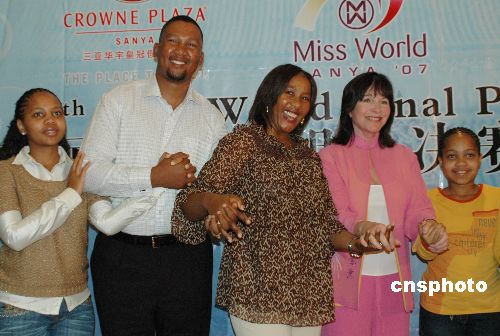 十一月二十九日,海南三亞,南非前總統(tǒng)曼德拉的長女(中)長孫(左二)現(xiàn)身海南三亞,在世界小姐機(jī)構(gòu)舉行的新聞發(fā)布會(huì)(右二為世界小姐機(jī)構(gòu)主席莫莉夫人)上呼吁更多的人關(guān)注艾滋病在全球的蔓延、關(guān)愛艾滋病患者。他們此行還帶來了家鄉(xiāng)的兒童合唱團(tuán),將于十二月一日晚舉行的第五十七屆世界小姐總決賽晚會(huì)上亮相。中新社發(fā) 尹海明 攝