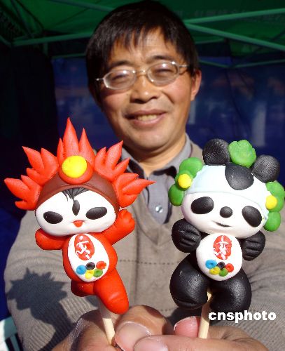 2007年12月5日,蘇州面塑藝人呂樹華用一雙巧手捏出的奧運福娃造型面塑作品,形象逼真、可愛,表達了他對2008年奧運會的美好祝愿。中新社發 王建康 攝
