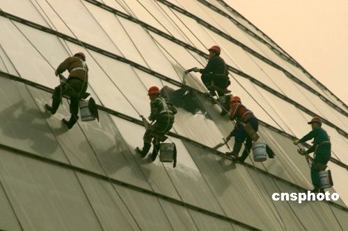 12月9日,北京清潔工人通過吊索懸掛設備清洗國家大劇院玻璃外殼上的塵埃。12月22日晚,國家大劇院將以其華麗的演出陣容拉開國際演出季的序幕。據悉,此次國家大劇院音樂廳開幕慶典將于12月22日至24日舉辦,包括兩場開幕慶典音樂會和一場歌劇精粹音樂會。目前,國家大劇院各項設施全部就位,正在進行首輪演出前的最后準備。中新社發 鄒憲 攝
