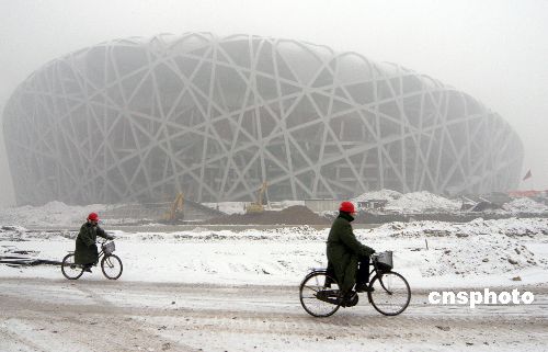 圖:北京降下今冬第一場雪 奧運場館雪中朦朧