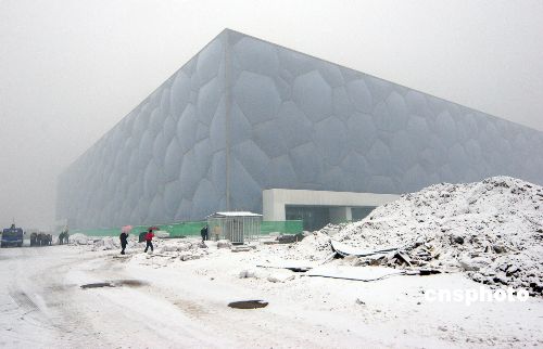 12月10日晨,北京降下今冬第一場雪,奧運場館“鳥巢”、“水立方”在雪中朦朦朧朧,顯得分外妖嬈。中新社發 吳芒子 攝