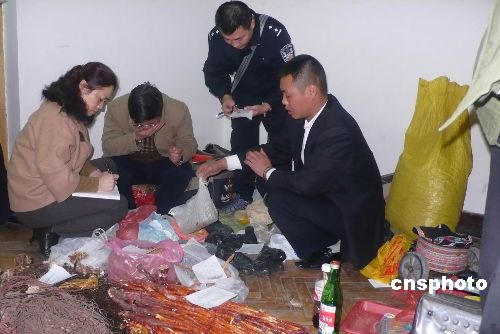 十二月九日下午,廣西柳州四名市民服用了街頭游醫(yī)的藥酒后中毒住進醫(yī)院,其中一人死亡,一人還在搶救中未脫險,另兩人經(jīng)搶救脫離生命危險。柳州警方經(jīng)過連續(xù)六個小時的偵查,分別在柳州和來賓抓獲街頭售藥的兩名“夫妻游醫(yī)”,并在他們的出租屋內(nèi)查獲大量草藥。中新社發(fā) 秦付林 攝