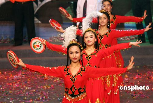 12月11日下午,新疆伊犁哈薩克自治州舉辦了歡慶2007年古爾邦節(jié)文藝晚會,演員們通過舞蹈、歌曲、小品等多種形式,展示了穆斯林群眾喜慶歡樂的節(jié)日氣氛和團(tuán)結(jié)奮進(jìn)、昂揚向上的精神風(fēng)貌。2007年12月20日是穆斯林群眾的傳統(tǒng)節(jié)日古爾邦節(jié)。中新社發(fā) 劉成剛 攝
