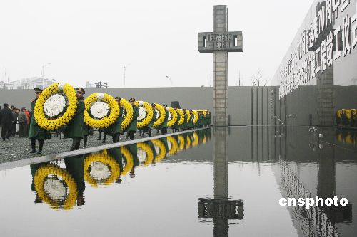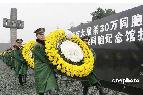 2007年12月12日,在侵華日軍南京大屠殺遇難同胞紀念館集會廣場上,武警南京市支隊國旗護衛隊隊員正在進行向南京大屠殺遇難同胞敬獻花圈儀式排練。12月13日是南京大屠殺紀念日,南京市將在此舉行悼念侵華日軍南京大屠殺30萬同胞遇難70周年紀念儀式暨侵華日軍南京大屠殺遇難同胞紀念館擴建工程竣工儀式。中新社發 韓華 攝