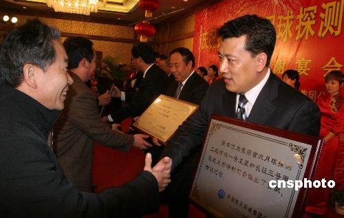 中國航天科技集團公司新任副總經理袁家軍(右)等向為該集團承擔首次月球探測工程研制任務提供幫助和支持的協作、配套單位授牌。
