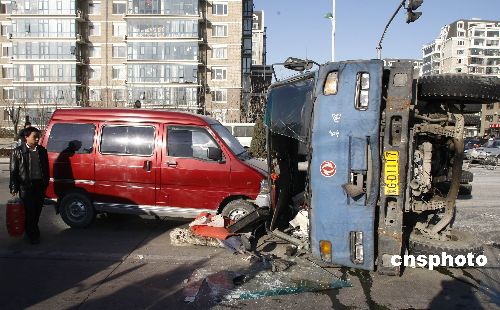 十二月十五日,北京天通苑小區(qū)門前道路,一輛拉載水泥板的大型貨車在路口拐彎時(shí)側(cè)翻,造成交通堵塞。中新社發(fā) 廖文靜 攝