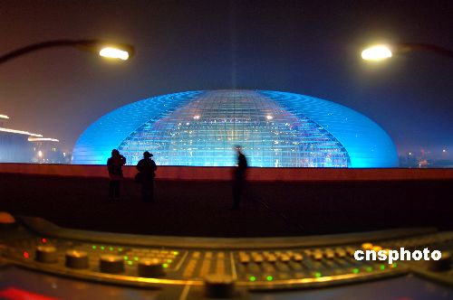 12月20日,北京國(guó)家大劇院測(cè)試首個(gè)演出季的外部燈光效果,藍(lán)色的燈光和背后高功率射燈將國(guó)家大劇院裝扮得夢(mèng)幻迷人。據(jù)悉,本次開(kāi)幕國(guó)際演出季將從2007年12月22日持續(xù)到2008年4月6日,期間將有78個(gè)劇目、180場(chǎng)精彩演出在這里隆重上演,其中三分之一為國(guó)外劇目,涵蓋了歌劇、舞劇、音樂(lè)會(huì)、話劇、民族戲曲五大藝術(shù)門(mén)類(lèi),預(yù)計(jì)接納觀眾30萬(wàn)人次。中新社發(fā) 廖攀 攝