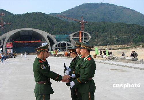 十二月二十四日,“南海一號”靠近碼頭等待漲潮后登陸,中國海事巡邏船、公安邊防艇在海上層層保衛(wèi),同時,警戒線已經(jīng)在岸上的博物館兩翼撒開,嚴(yán)禁無關(guān)人員進(jìn)入。圖為在海上絲綢之路博物館前執(zhí)勤的武警。中新社發(fā) 索有為 攝