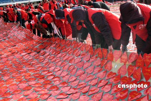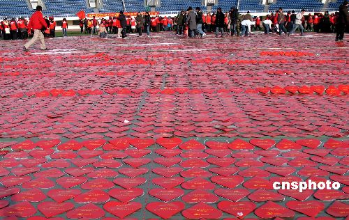 十二月二十九日,一個名為“共享健康·愛心接力”大型公益活動在北京奧體中心體育場和廣州奧體中心體育場同時展開。一千位來自中國各地的老人作為“愛心大使”,把載滿愛心故事的十萬顆小紅“心”貼成兩顆巨大的“愛心”,以沖擊吉尼斯世界紀(jì)錄。中新社發(fā) 黎仲顏 攝
