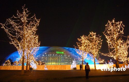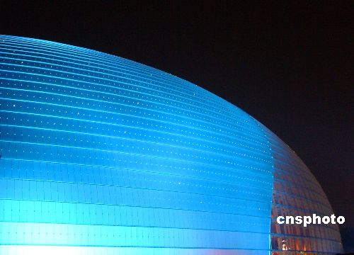 12月30日晚,北京國家大劇院四周燈光閃爍,夜色璀璨,蔚藍(lán)色的國家大劇院在夜幕中顯得美麗迷人。當(dāng)晚,有關(guān)人員在調(diào)試燈光,以迎接12月31日在這里舉行的2008年新年音樂會(huì)。中新社發(fā) 玉龍 攝