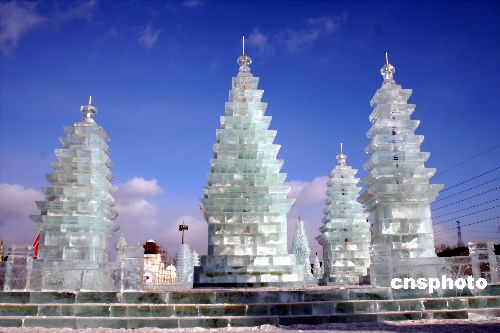 2007年12月31日,沈陽棋盤山冰雪大世界云南大理三塔等大型冰雕及雪雕已現雛形。1月8日,2008沈陽國際冰雪節將開幕。中新社發 劉寶成 攝