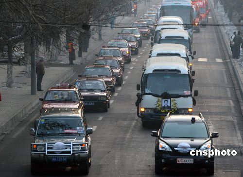 一月七日,新疆烏魯木齊,三千余輛出租車自發(fā)組成車隊(duì)浩浩蕩蕩為烈士送行。當(dāng)日,在撲滅“1.2”烏魯木齊德匯國(guó)際廣場(chǎng)大火中犧牲的三位消防官兵追悼會(huì)在該市殯儀館舉行,新疆各界人士及三千余輛出租車、萬(wàn)余市民自發(fā)為三位烈士送別。中國(guó)公安部已批準(zhǔn)壯烈犧牲的烏魯木齊消防支隊(duì)官兵朱曉雷、張宇、高峰三人為“革命烈士”。中新社發(fā) 劉新 攝