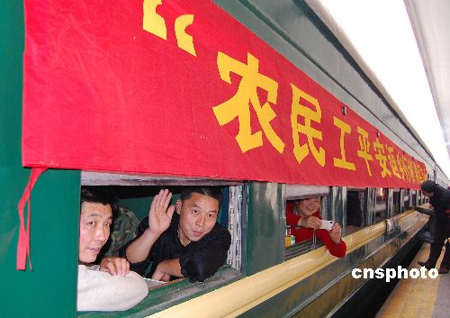 一月八日下午,廣州火車站發(fā)出今春首趟珠三角農(nóng)民工平安返鄉(xiāng)專列,一千七百多名農(nóng)民工乘專列途經(jīng)廣東、湖南、湖北、河南四省,開往河南省會城市鄭州。中新社發(fā) 柯小軍 攝
