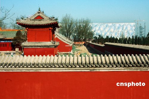 1月11日,為保持明代建筑風貌,曾迫使北京的國家游泳中心“水立方”施工位置北移的北頂娘娘廟,近日完成階段性施工。位于“水立方”南側的北頂娘娘廟為明代廟宇,是北京歷史上著名的“五頂八廟”之一、北京城中軸北延長線上的一個標志性建筑。修繕一新的北頂娘娘廟紅墻、琉璃瓦的古典味,與“水立方”的現代化遙遙相對形成強烈對比。中新社發 鄭雄增 攝