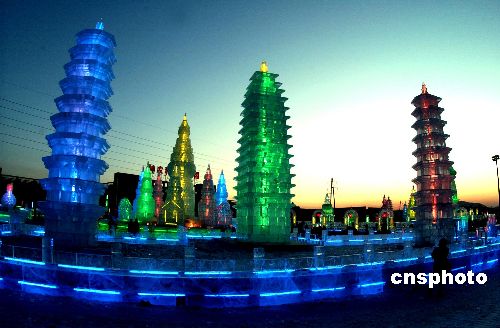 1月11日晚,2008中國沈陽國際冰雪節(jié)開幕。本屆冰雪節(jié)的雪雕和冰雕超越歷屆冰雪節(jié),創(chuàng)下數(shù)量、高度和規(guī)模之最。開幕式上《從雅典到北京》、《龍騰奧運》等六座大型雪雕與杭州古塔、沈陽舍塔等建筑冰雕等點亮了主會場棋盤山之夜。 中新社發(fā) 羅瀾 攝
