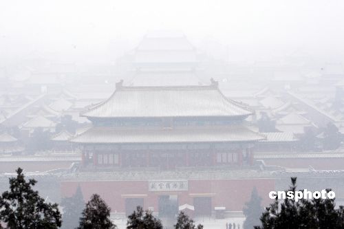 1月17日,北京故宮被白雪覆蓋,京城迎來了2008年的第一場降雪,伴著寒風,小雪很快灑滿了京城的大街小巷。中新社發 杜洋 攝