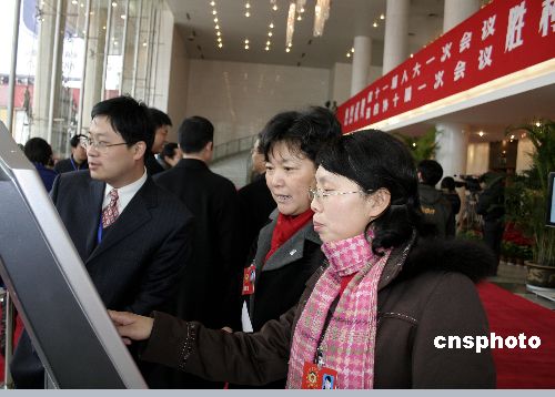 圖為政協(xié)委員在自助機前查詢大會相關資料。