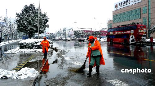 1月26日,江蘇揚州干部群眾一起上街清掃路面積雪,開辟出一條條干凈、通暢的道路,保證了市民正常生活出行。據江蘇省氣象局分析,從1月25日夜到29日,江蘇將出現持續性降雪天氣,較大降雪出現在27日至28日,氣溫持續偏低,并會出現冰凍。中新社發 崔佳明 攝