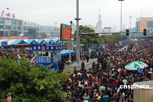 因受惡劣天氣影響,京廣鐵路一百多趟客車大面積晚點,截至一月二十七日下午,仍有十五萬旅客被迫滯留廣州火車站廣場。中新社發 柯小軍 攝