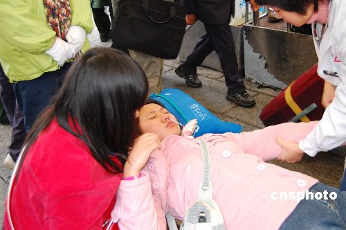 京廣鐵路湖南段從25日起出現大面積旅客列車晚點,到28日仍未恢復正常秩序,仍有七萬多名旅客被迫滯留在廣州火車站。由于長時間候車,有的旅客在現場暈倒,醫護人員進行了緊急救治。中新社發 柯小軍 攝