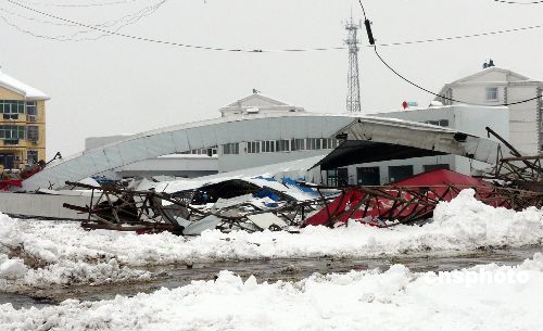 1月29日,安徽合肥經濟開發區一加油站因不堪暴雪重負,轟然倒塌,目前救援工作正在進行中。中新社發 成展鵬 攝