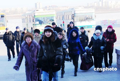 1月31日,大批俄羅斯旅游者進(jìn)入黑河口岸。據(jù)黑河邊檢站披露:自黑龍江冰上汽車(chē)運(yùn)輸開(kāi)始以來(lái),黑河口岸進(jìn)出境旅客達(dá)106000人次,同比增長(zhǎng)45%。黑河口岸2008年實(shí)現(xiàn)首月進(jìn)出境旅客“開(kāi)門(mén)紅”。中新社發(fā) 邱齊龍 攝